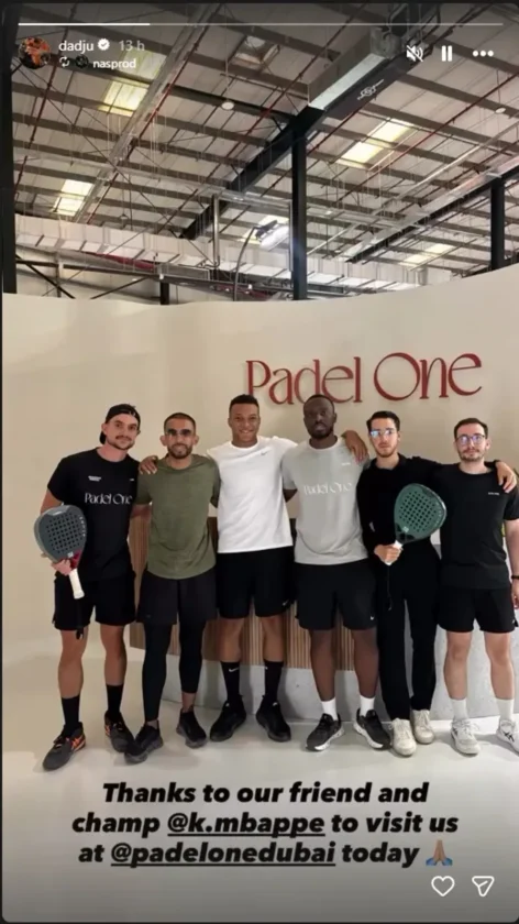 Le chanteur Dadju a posté une story Instagram dans laquelle on Kylian Mbappé poser avec des membres de ce club, « Padel One ». Mais sans raquette. « Merci à notre ami et champion Kylian Mbappé de nous avoir rendu visite aujourd’hui », est-il écrit.