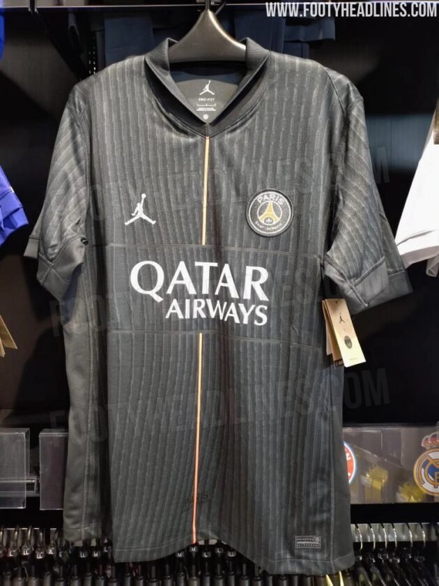 Le nouveau 4e maillot du Paris Saint-Germain n’a pas encore été officialisé, mais il circule déjà en boutiques ! Révélé par Footy Headlines, ce jersey Jordan pour la saison 2025-2026 attire l’œil avec son look sombre et ses touches colorées.
