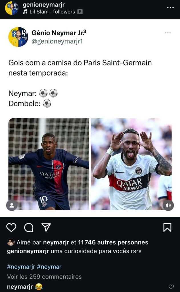 Sur Instagram, Neymar a commenté les statistiques d’Ousmane Dembélé au PSG cette saison : «Neymar, 2 buts avec le PSG cette saison. Ousmane Dembélé, 1 but», relève cette stat. Une publication commentée par des émojis rires de la part du joueur de la Seleçao. Pas cool.