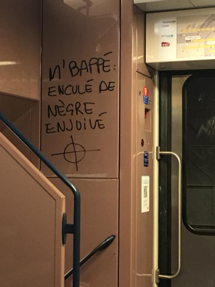 Le tag visant Kylian Mbappé a été repéré sur la ligne C du RER parisien. Il a été dénoncé et relayé par l’ex-président de SOS Homophobie, Yohann Roszéwitch. Sur ce tag, on peut lire : « M’ Bappé : enculé de nègre enjuivé », suivi d’un symbole associé à des mouvements d’extrême droite néonazis, néofascistes en antisémites.